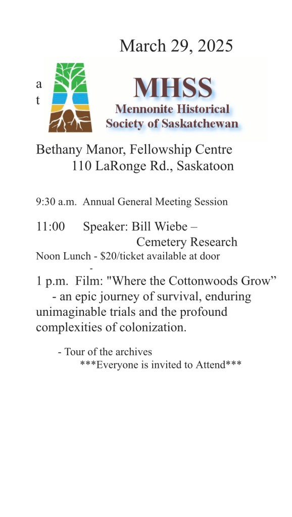 MHSS is offering a Mennonite History virtual class via Zoom. The presenter is Roydon Loewen, the topic is the Anabaptists at 500. Classes are Wednesdays from 9 am to 10 am starting October 1 to November 5 at the MHSS Archives at Bethany Manor. All are welcome.